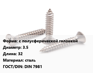 Саморез с полусферической головкой D=3.5 L=32 сталь ГОСТ: DIN 7981