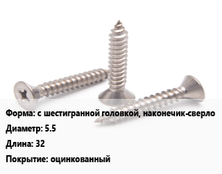 Саморез с шестигранной головкой, наконечик-сверло D=5.5 L=32 оцинкованный