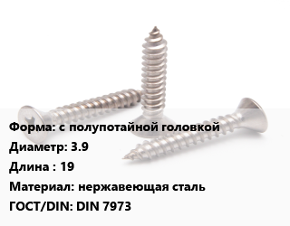 Саморез с полупотайной головкой D=3.9 L=19 нержавеющая сталь ГОСТ: DIN 7973