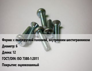 Винт с полукруглой головкой, внутренним шестигранником 6х12 ISO 7380-1:2011 оцинкованный