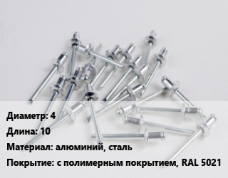 Заклепка 4х10 алюминий, сталь с полимерным покрытием, RAL 5021, упаковка 1000 шт, вытяжная цена от 428.22 Тг / шт, где купить, условия доставки в Павлодаре и Павлодарской области