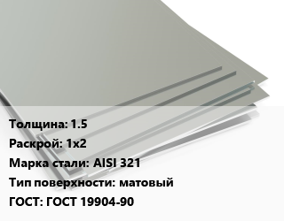 Лист нержавеющий 1.5 1х2 Сталь: AISI 321 Тип:матовый ГОСТ 19904-90, х/к, по запросу цена от 341 445 Тг / т, где купить, условия доставки в Павлодаре и Павлодарской области