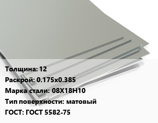 Лист нержавеющий 12 0.175х0.385 Сталь: 08Х18Н10 Тип:матовый ГОСТ 5582-75